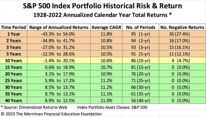 IFM 的设计目标不是让用户一夜暴富,而是通过追求市场平均收益(长期复合年化收益率)稳步实现财务自由。研究数据表明(见图 1.1):当“长期” >= 15(年),以标普 500 为投资标的的投资几乎不会亏损,平均年化收益率超过 10%;一旦“长期” >= 30(年),即便是最差的年化收益率(极坏运气的情况)也将达到 8.5%。